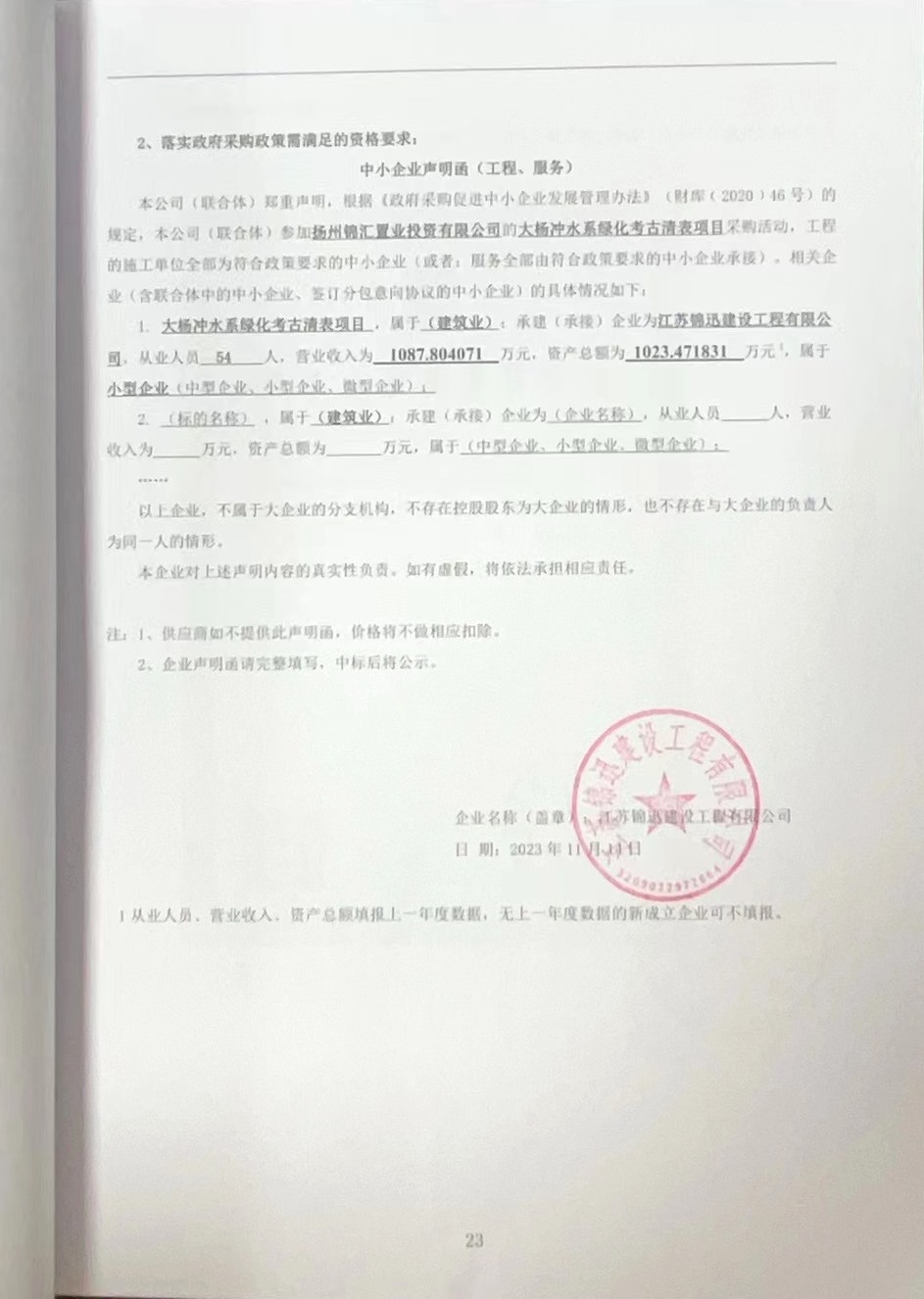五、評審專(zhuān)家名單:徐敬雯、范存余、殷志權 六、公告期限 自本公告發(fā)布之日起1個(gè)工作日。 七、其他補充事宜 無(wú) 八、凡對本次公告內容提出詢(xún)問(wèn),請按以下方式聯(lián)系。 1.采購人信息 名 稱(chēng):揚州錦匯置業(yè)投資有限公司 2.采購代理機構信息 名 稱(chēng):揚州筑苑工程招標咨詢(xún)有限公司 地 址:揚州潤揚北路19號 聯(lián) 系 人:李斌 聯(lián)系電話(huà):0514-87116778 3.項目聯(lián)系方式 項目聯(lián)系人:李斌 電 話(huà):0514-87116778 中小企業(yè)聲明函.jpg