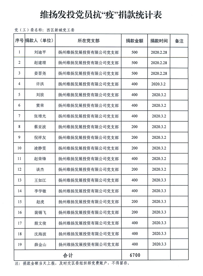 為積極響應區委、區政府號召,表達公司黨員職工對疫情防控工作的堅定支持。3月3日下午,由公司黨支部牽頭,組織黨員干部、普通職工以及相關(guān)合作單位開(kāi)展自愿捐款活動(dòng),支持疫情防控。 公司黨支部書(shū)記、副董事長(cháng)劉迪平首先發(fā)起捐款倡議,“黨有號召,我有行動(dòng)”。班子成員緊隨其后,黨員職工及合作企業(yè)紛紛響應,踴躍捐款,用點(diǎn)滴愛(ài)心集聚起支援疫情防控的強大正能量。 涓流不吝,以成江河。截止目前,公司黨支部一共向邗江區委組織部賬戶(hù)匯入黨員抗疫特殊黨費6700元。公司員工及合作單位也籌集了13400元的抗疫愛(ài)心捐款,匯款至邗江區紅十字會(huì )。 疫情期間,我公司全體黨員干部職工,以實(shí)際行動(dòng)為疫情防控盡一份心意,詮釋了共產(chǎn)黨員和國企人的初心本色。