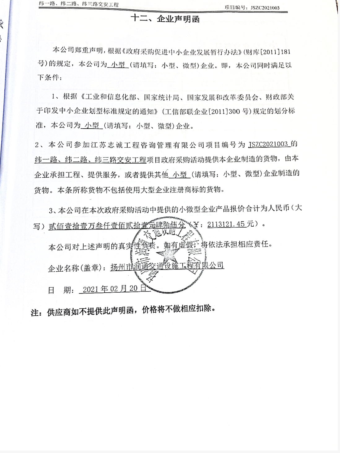 一、項目編號:JSZC2021003號 二、項目名稱(chēng):緯一路、緯二路、緯三路交安工程 三、中標信息 供應商名稱(chēng):揚州市潤通交通設施工程有限公司 供應商地址:甘泉鎮雙塘村 中標金額:人民幣2428703.7元 四、主要標的信息 工程類(lèi) | 名稱(chēng):緯一路、緯二路、緯三路交安工程 施工范圍:緯一路、緯二路、緯三路交安工程(具體內容詳見(jiàn)工程量清單) 施工工期:30 天 項目經(jīng)理:吳益明 執業(yè)證書(shū)信息:蘇232151617052 |