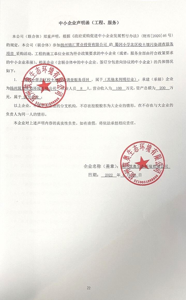 五、評審專(zhuān)家名單:茅劍、姚勝、李久云 六、代理服務(wù)收費標準及金額: 4200元 七、公告期限 自本公告發(fā)布之日起1個(gè)工作日。 八、其他補充事宜 無(wú) 九、凡對本次公告內容提出詢(xún)問(wèn),請按以下方式聯(lián)系。 1、采購人信息 名 稱(chēng):揚州錦匯置業(yè)投資有限公司 2、采購代理機構信息 名 稱(chēng):揚州筑苑工程招標咨詢(xún)有限公司 地 址:揚州市潤揚北路19號 聯(lián) 系 方 式:0514-87116778 3.項目聯(lián)系方式項目聯(lián)系人:李斌 電 話(huà):0514-87116778 小微企業(yè)申明.jpg