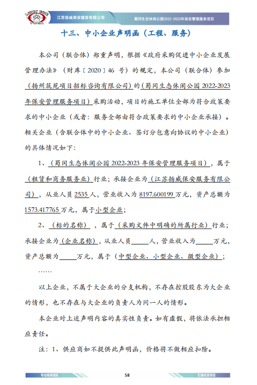 五、評審專(zhuān)家名單:趙龍祥、謝輝、殷志權 六、公告期限:自本公告發(fā)布之日起1個(gè)工作日。 七、其他補充事宜:無(wú) 八、凡對本次公告內容提出詢(xún)問(wèn),請按以下方式聯(lián)系。 1、采購人信息 名 稱(chēng):揚州維投物業(yè)管理有限公司 2、采購代理機構信息 名 稱(chēng):揚州筑苑項目招標咨詢(xún)有限公司 地 址:揚州市潤揚北路19號 聯(lián) 系 方 式:0514-87116778 3、項目聯(lián)系方式 項目聯(lián)系人:李斌 電 話(huà):0514-87116778 小微企業(yè)聲明函.jpg